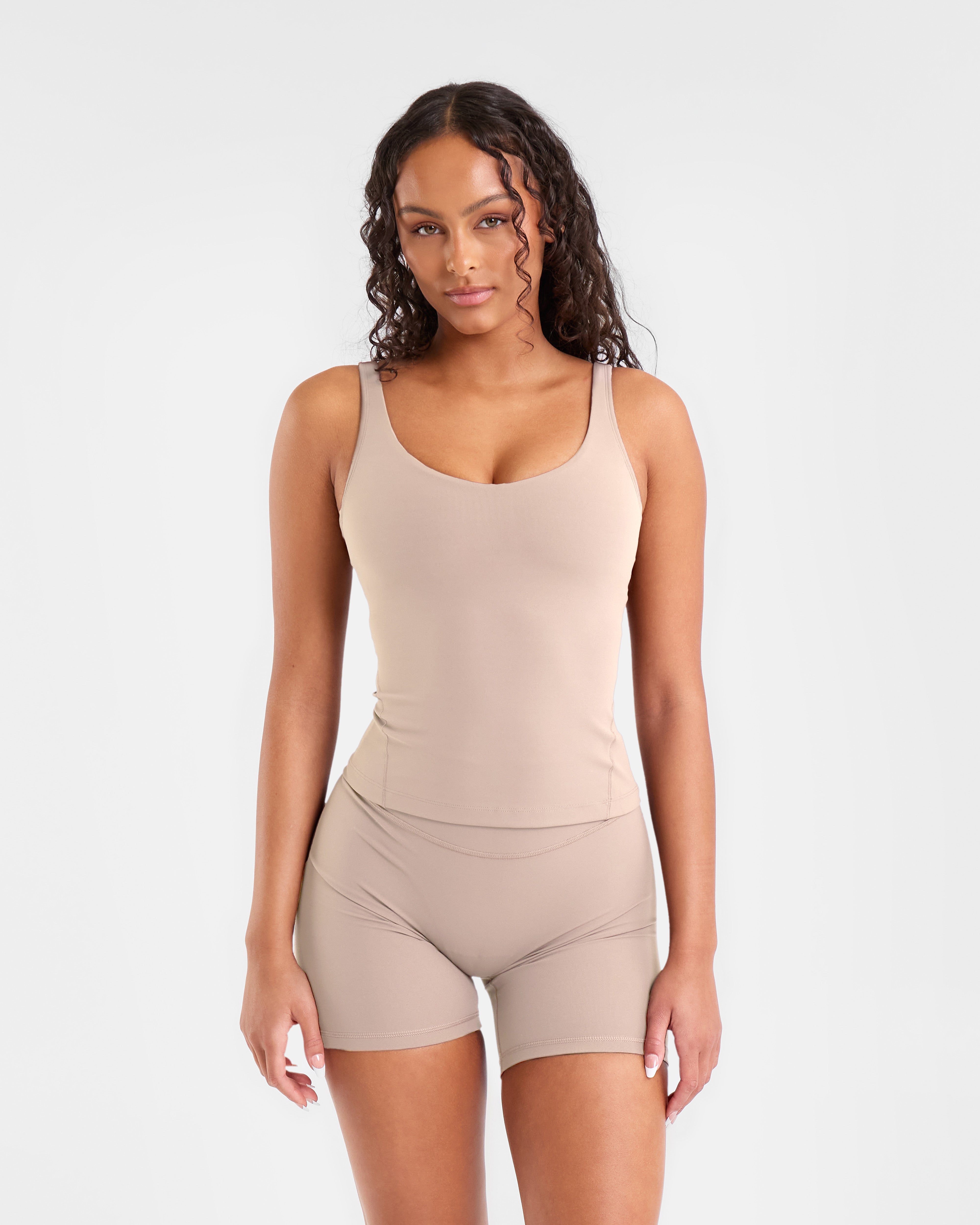 Þessi fallegi toppur er með innbyggðum brjóstahaldara og fjarlægjanlegum púðum. Hann veitir miðlungs stuðning og er úr efni sem dregur vel í sig raka og svita, sem gerir hann fullkominn fyrir æfingar eða daglega notkun.